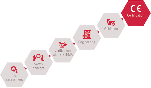 We kunnen u direct vanaf de ontwikkelingsfase ondersteunen en u begeleiden bij elke stap die nodig is om de CE-markering voor uw machine te verkrijgen. Hoe eerder u ons in het proces betrekt, hoe groter de voordelen. Door al tijdens de ontwikkelingsfase rekening te houden met de veiligheidsaspecten kan de werkdruk op de lijn aanzienlijk worden verlaagd zodat u van meet af aan een zo veilig mogelijke machine kunt ontwerpen.